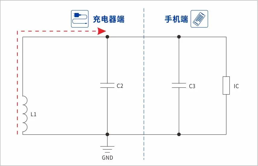 如上圖,總會(huì)存在一些斷開充電的瞬間,漏感L1給C2、C3充電,除此之外,充電端到手機(jī)端整個(gè)充電回路其實(shí)也有電感存在??傊覀兌伎梢园阉粗荓1 。