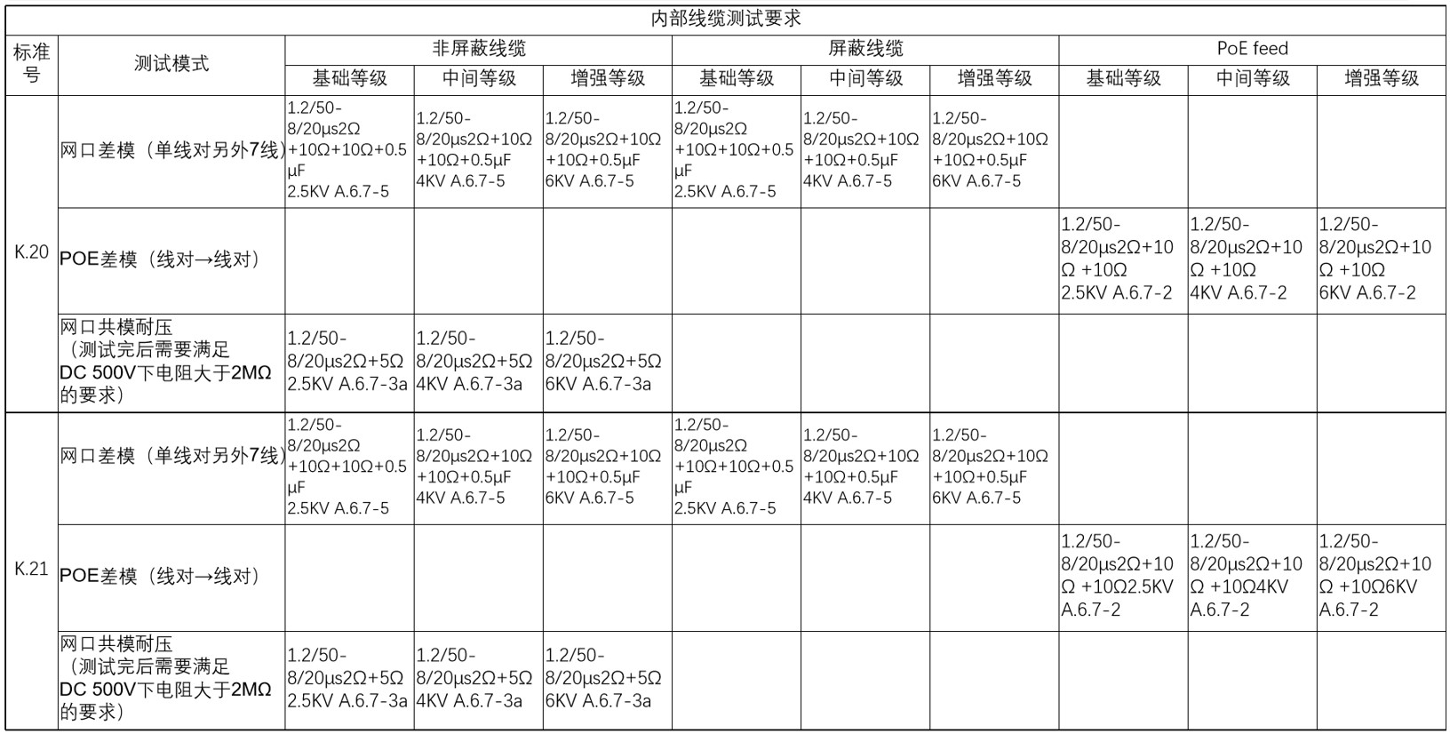 根據(jù)ITU-T K.20/K.21的測試要求,網(wǎng)口常見的測試等級如下: