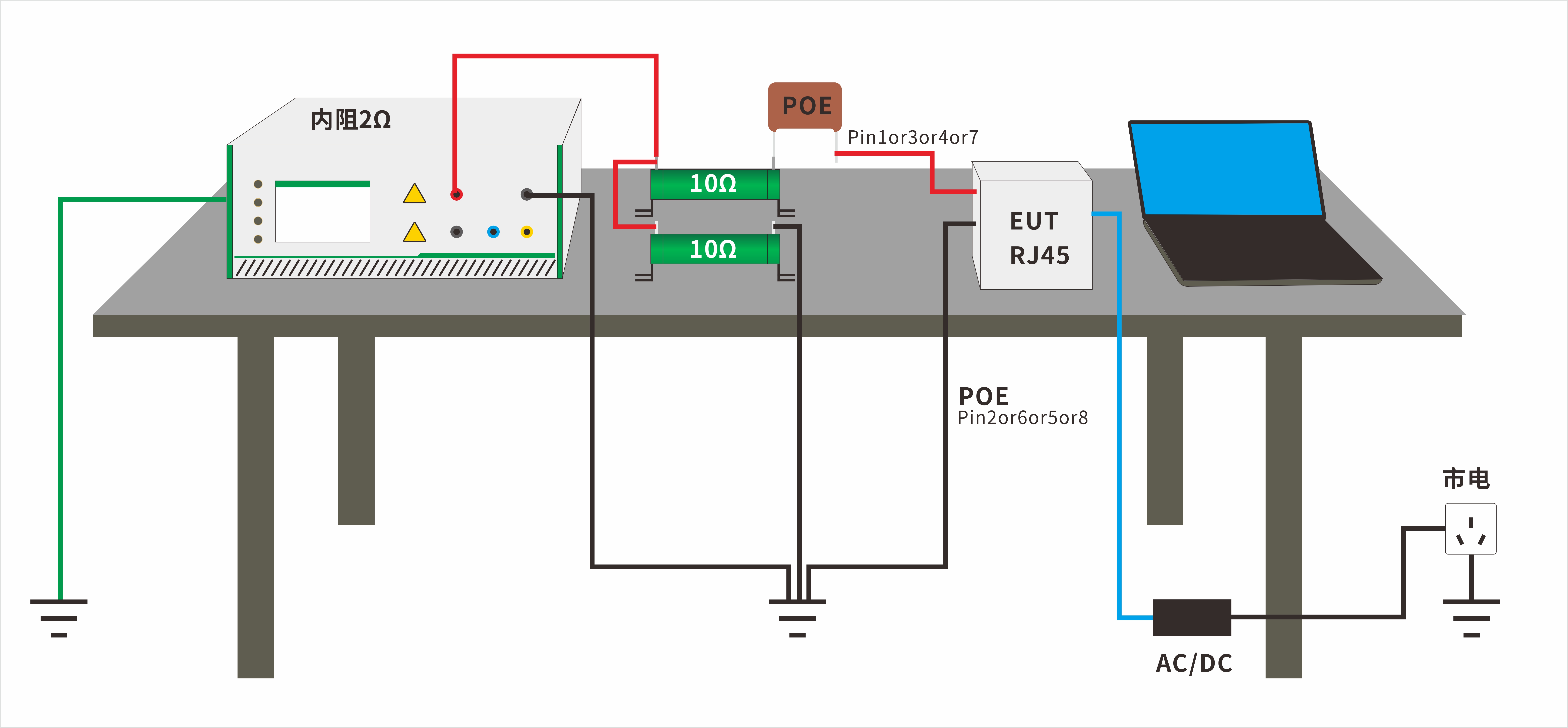 從上表得知,室內(nèi)10G網(wǎng)口的防護(hù),最高等級為差共模6KV,測試的接線圖分別如下: