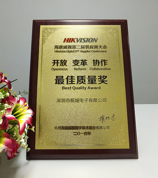 2014年,檳城電子憑借優(yōu)質(zhì)的產(chǎn)品和完善的服務(wù),在??低暤墓?yīng)商大會上喜獲“最佳質(zhì)量獎”的榮譽(yù),這對一直在努力的檳城人是一個莫大的鼓舞,我們的汗水沒有白流,我們付出得到了收獲,全體檳城人將再接再厲,創(chuàng)造出更加美好的明天!
