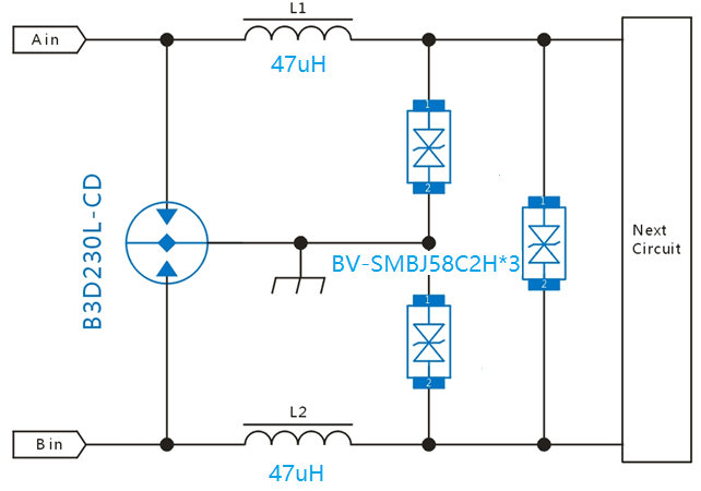 共模電感后極增加TVS管做二級保護(hù),TVS選型可以用BV-SMCJ58CA,BV-SMDJ58CA,BV-5SMDJ58CA,實際選用功率大小與PTC、共模電感退耦有關(guān)系。