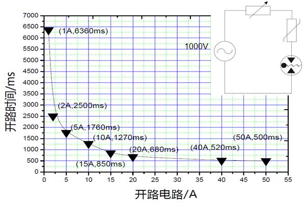 開路失效氣體放電管可以滿足這三點(diǎn)性能,且可以在工頻過(guò)來(lái)時(shí)很快切斷電路,如下圖為開路失效氣體放電管的工頻電流和斷開時(shí)間測(cè)試曲線: